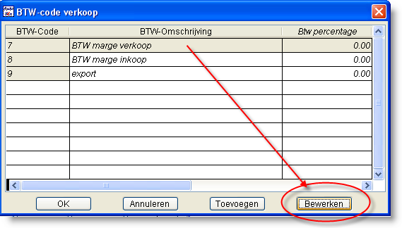 Open de betreffende omzetgroep via menu: systeem – financieel – omzetgroepen en selecteer de 'BTW code verkoop' middels het pijltje erachter |