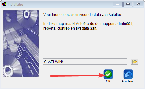 Installeer het programma Autoflex altijd op dezelfde schijf als waar AFLWIN (database) map staat. De Setup installeert standaard op C:\Autoflex, we raden aan dit niet te wijzigen