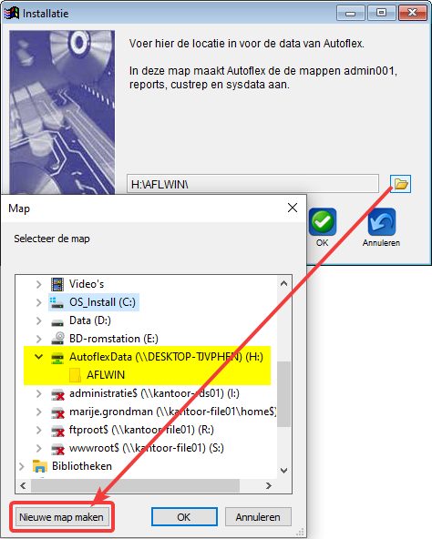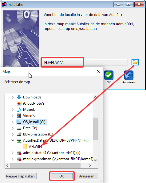 Kopieer de bestaande AFLWIN map naar netwerkschijf uit stap 1. In ons voorbeeld wordt het volledige pad H:\AFLWIN