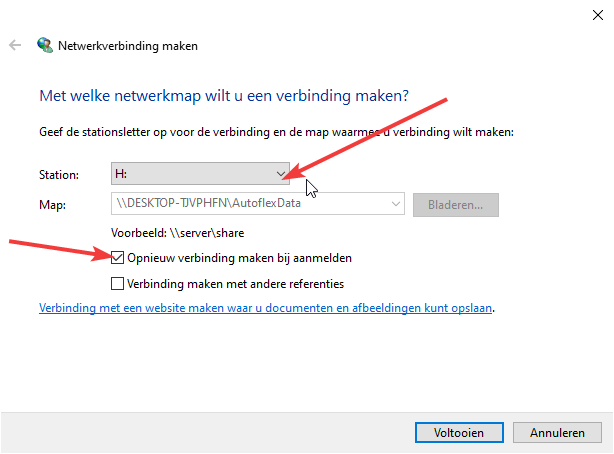 Kies een schijfletter die nog niet in het netwerk gebruikt wordt, bijvoorbeeld H: en voltooi het proces.